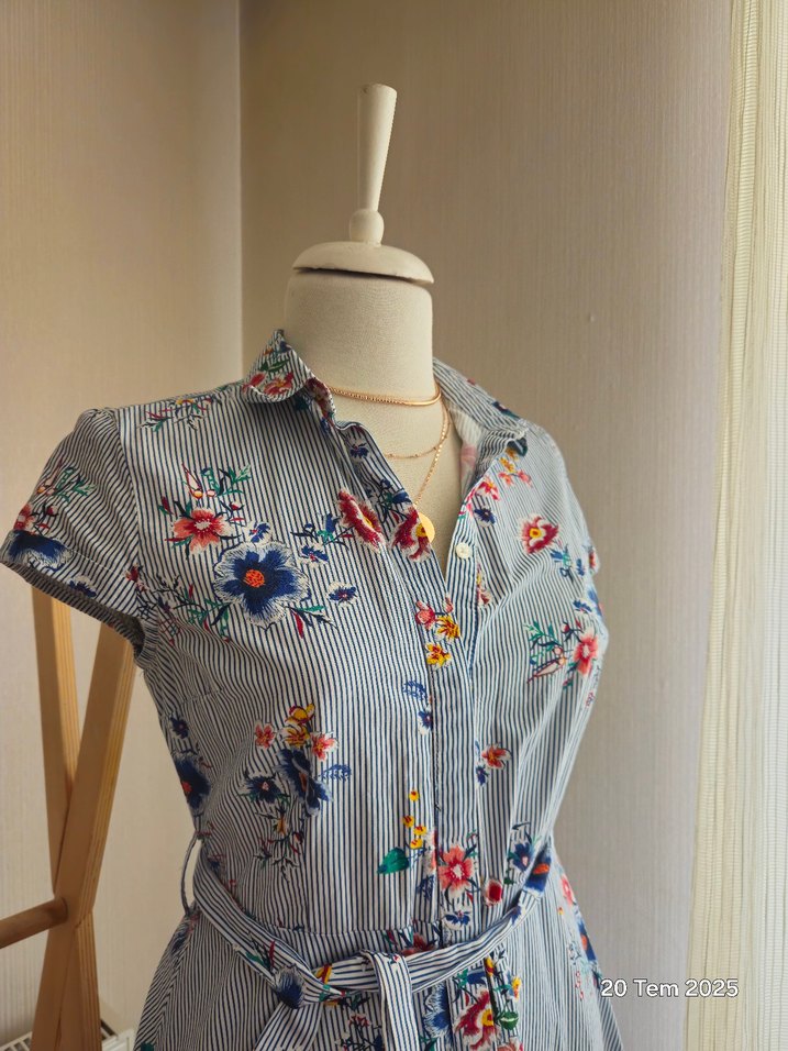 Çiçek desenli, düğmeli ve kısa kollu gomlek ebise. Çizgili gri kumaş üzerine vintage tarzda, midi boy ve bel kemerli, bohem stil sunar.