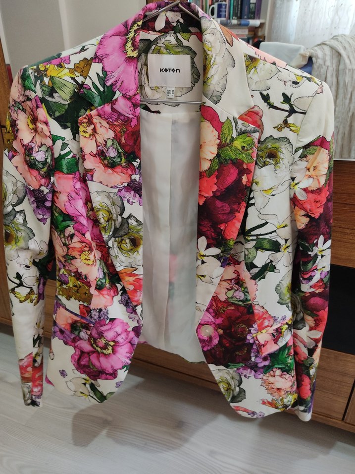 Çiçek desenli, düğmeli, uzun kollu, normal boyda, fitted kadın ceket. 36 beden. Ofis için uygundur.