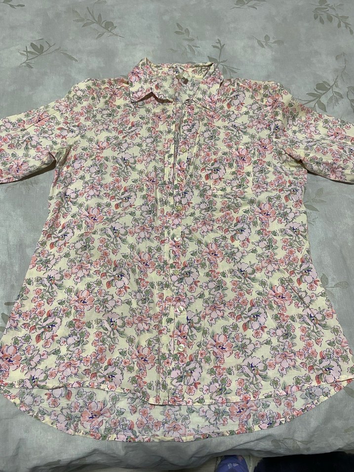 Pamuklu, düğmeli, kısa kollu, bol kesim, pastel çiçek desenli, normal boyda, yakalı kadın gömlek. Bohem tarz için uygundur.