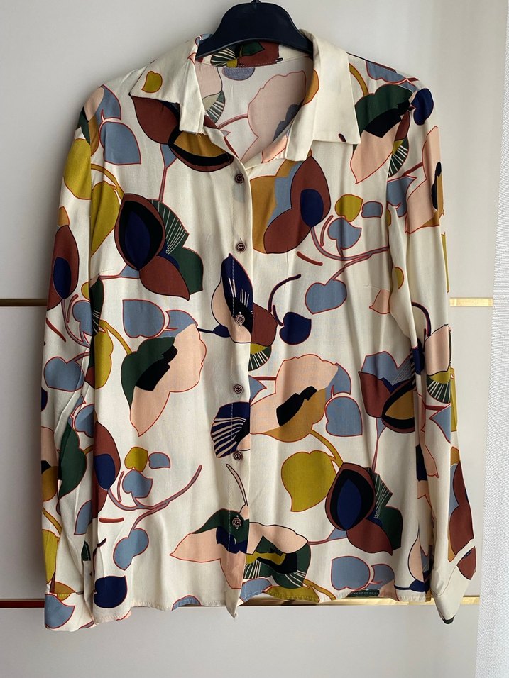 Renkli baskılı desenli, uzun kollu, düğmeli. 1 kez kullanıldı. Defosu yoktur. 36 bedendir. Beden etiketi kesilmistir