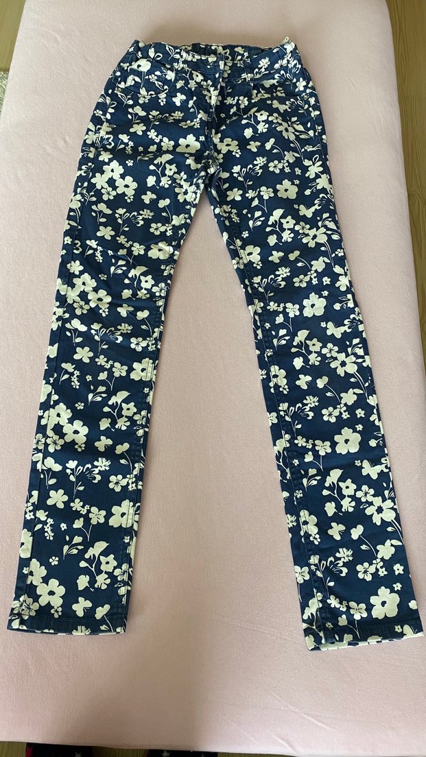 Koyu renkli çiçek desenli kot pantolon, düğmeli ve normal boyda. Rahat kesimiyle günlük sokak stiline uygundur.