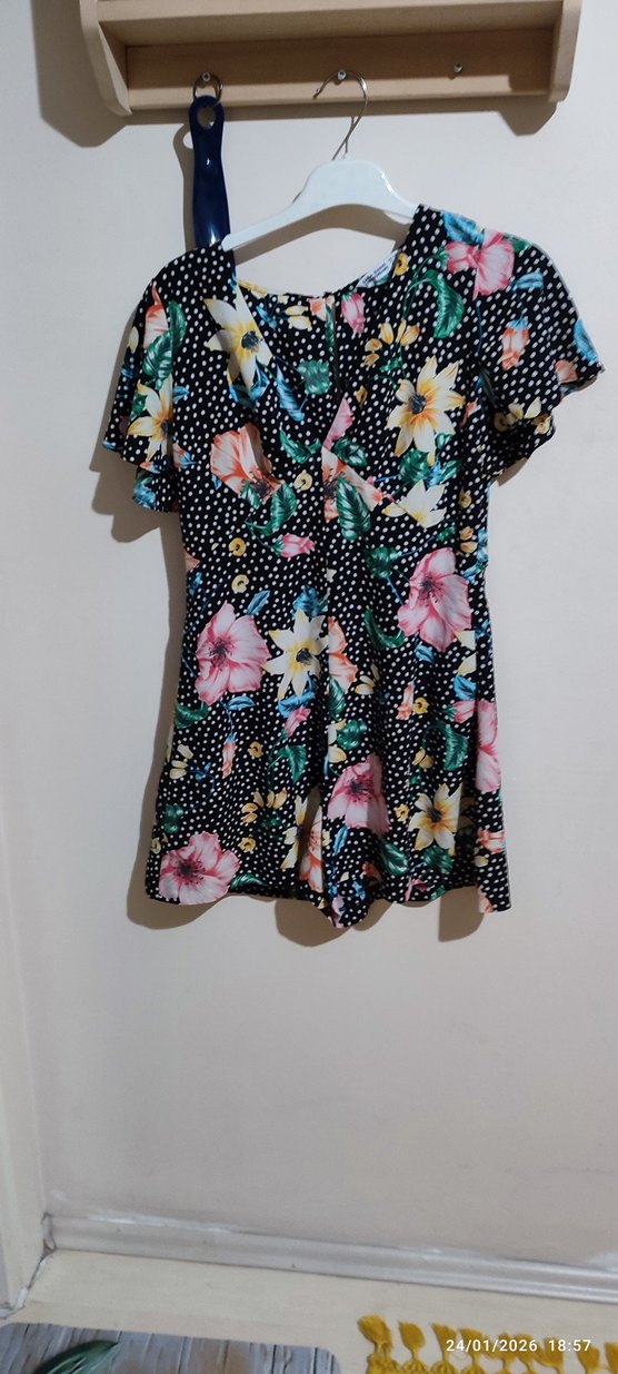 Kadınlar için kısa, çiçek desenli, kısa kollu ve V yakalı tulum. Sentetik kumaştan, düğmeli ve bol kesim, bohem tarzında.