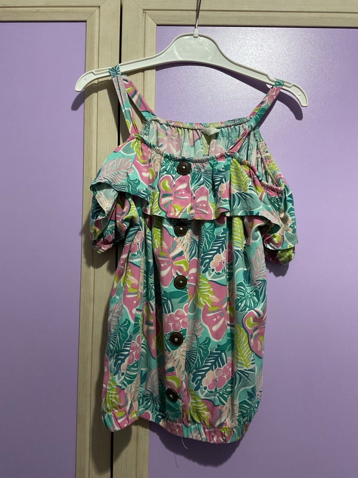 Renkli çiçek desenli, düğmeli ve bol kesim kız elbisesi. Yumuşak sentetik kumaştan, askısız ve kolsuz.