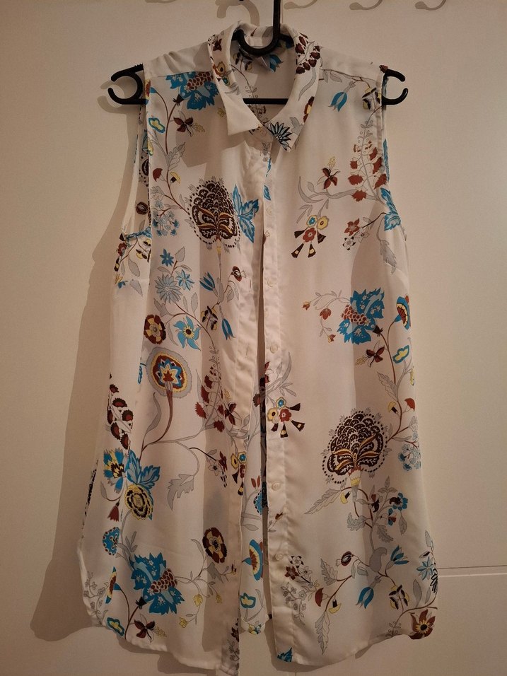 Kolsuz, straplez yakalı, çiçek desenli beyaz hafif kumaştan bohem gömlek. Bol kesim ve düğmeli detaylarla günlük kullanım için uygun.