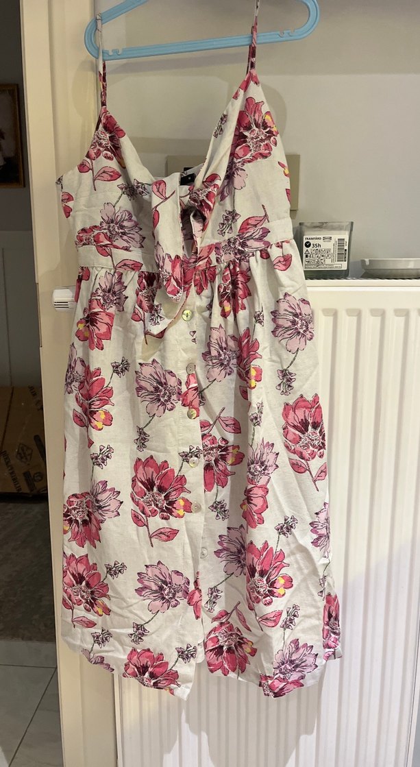 Düğmeli, askısız, kolsuz uzun elbise. Hafif pembe çiçek desenli, bol kesim ve keten pamuk kumaştan yapılmıştır. Bohem tarzı için uygundur. Göğüs bağlama detaylı