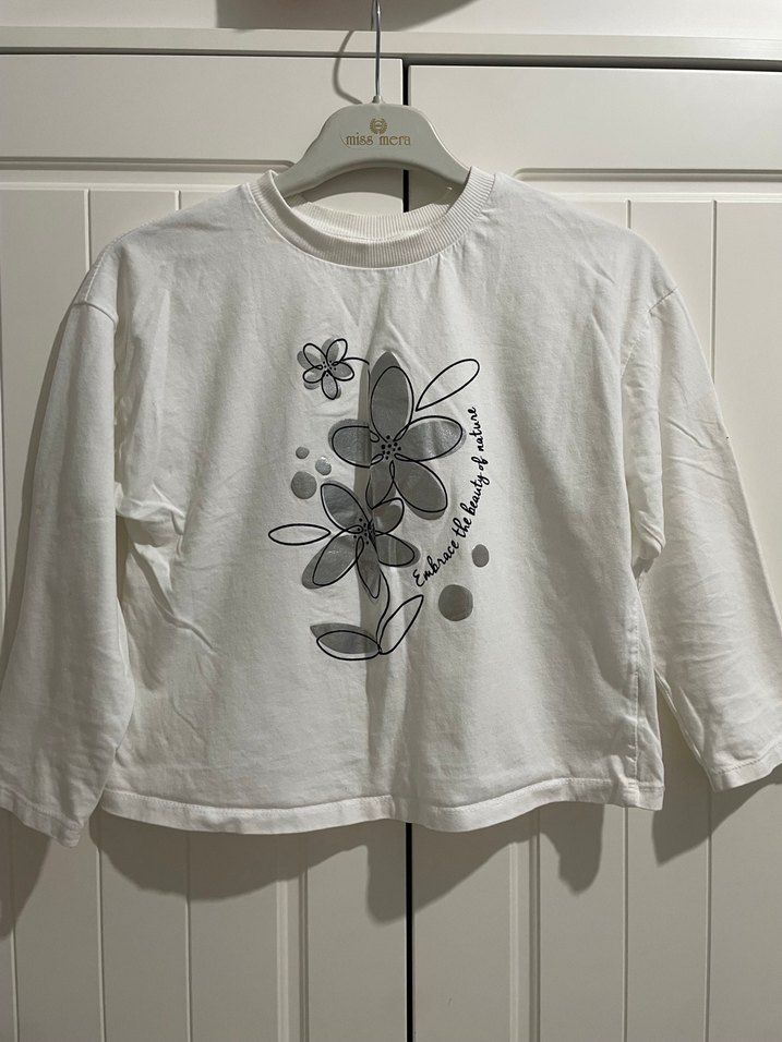 Pamuklu, beyaz renkli, uzun kollu kız tişörtü. Gri çiçek baskısı ve düğme detayları ile rahat ve salaş kesim, sokak stiline uygun. Az kullanıldı, kolunda boya var çıkar mı denemedin