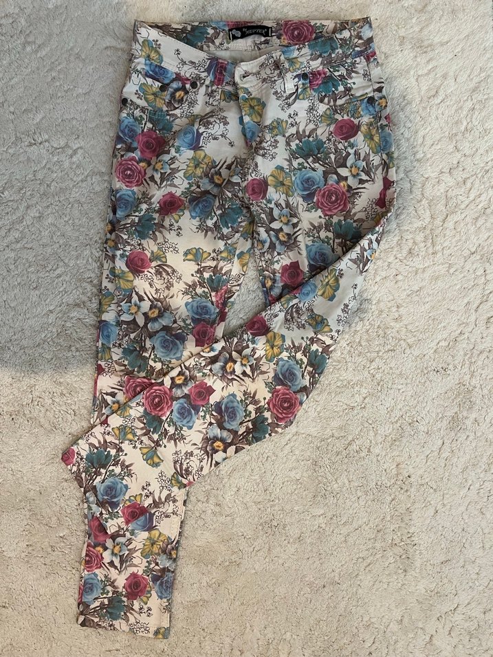 Rahat kesim, düşük bel pastel çiçek desenli kadın pantolon, bilek boyu. Dar kalıp