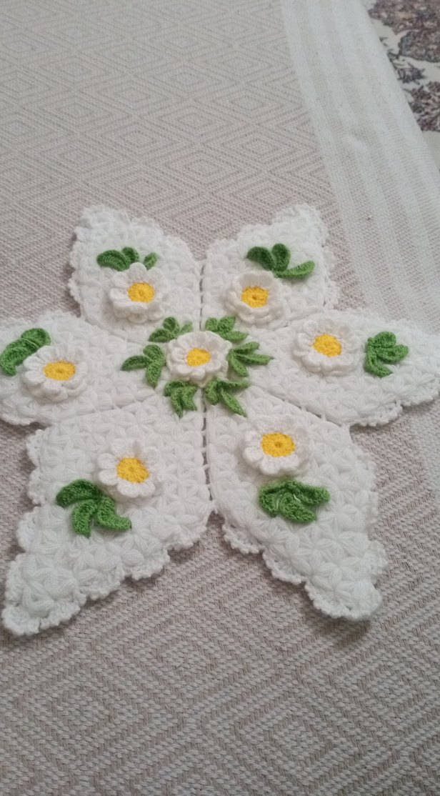 Sarı merkezli ve yeşil yapraklı çiçek desenlerine sahip, geleneksel tarzda el örgüsü beyaz lif kendi el emeğim yeni ördüm sıfır ürün