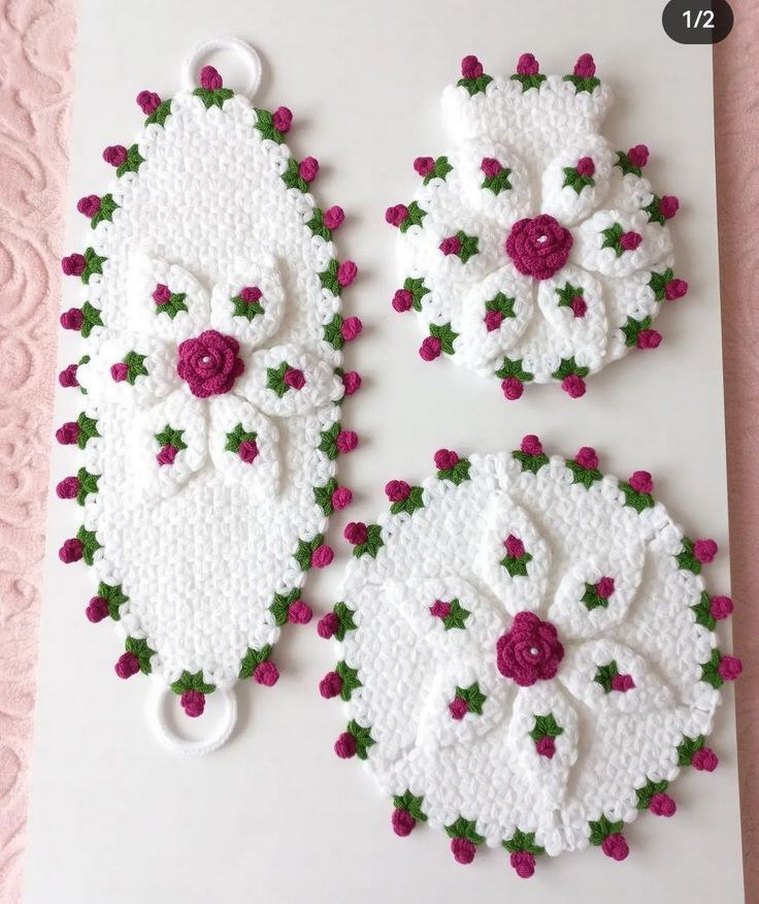 Üç parça beyaz el örgüsü, mor ve yeşil çiçek detaylarıyla süslenmiş dekoratif set, lif istenilen renk ve motifte hazırlanıyor