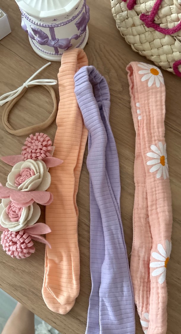 Pastel renklerde, çiçek desenli ve elastik yapıda, yumuşak kumaştan bohem tarzı çocuk saç bantları.