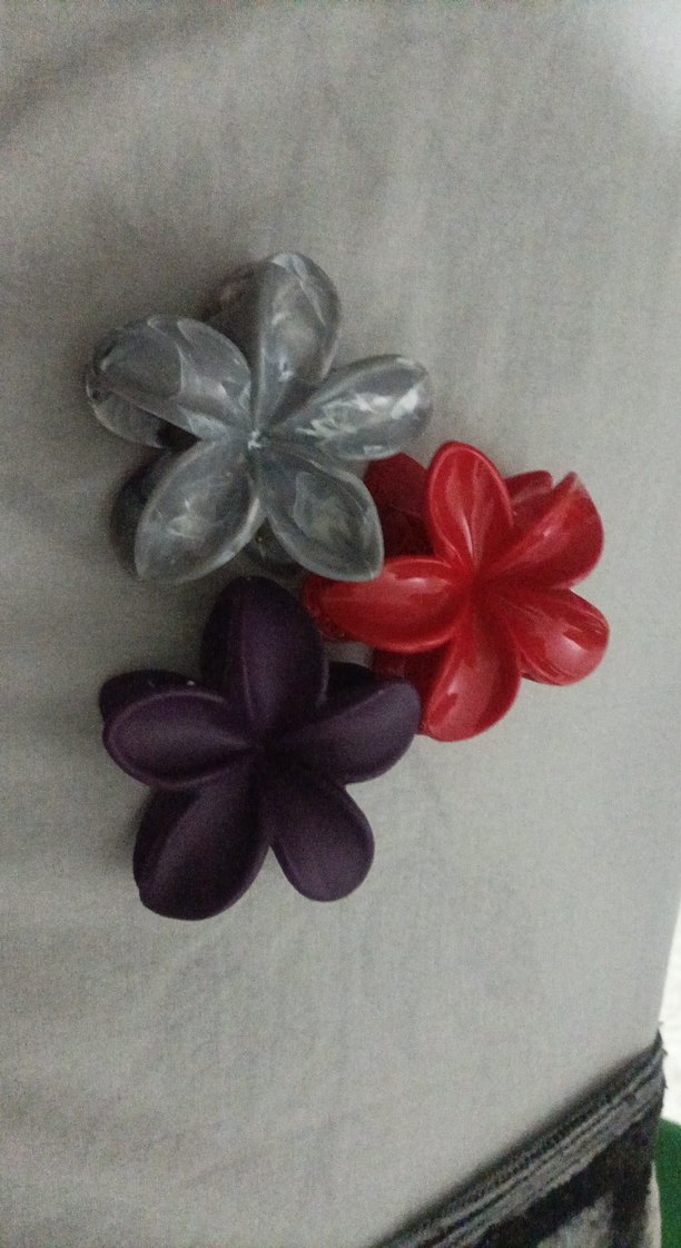 Plastik malzemeden yapılmış, koyu renkli, çok renkli çiçek desenli üç elastik saç tokası seti. Minimalist ve sade tarz.