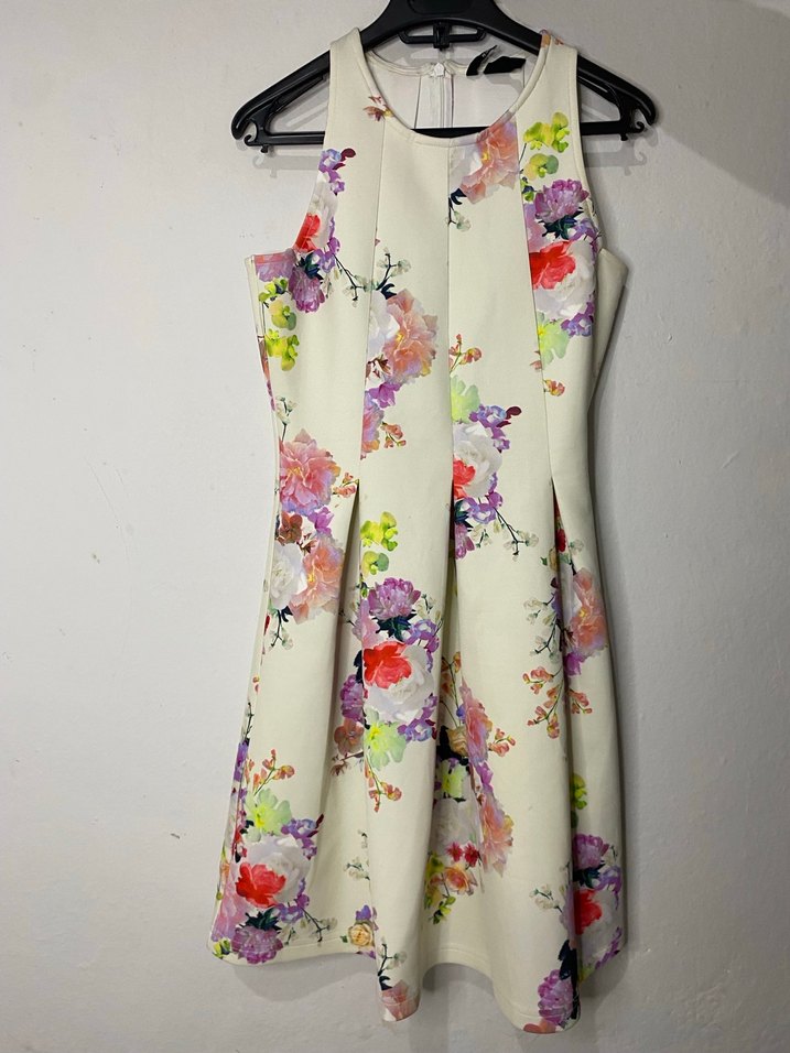 Askısız, kolsuz bu elbise, çiçek desenli pastel tonlarda, pileli ve vücuda oturan kesime sahiptir. Sentetik kumaştan yapılmıştır ve düğün için uygundur.