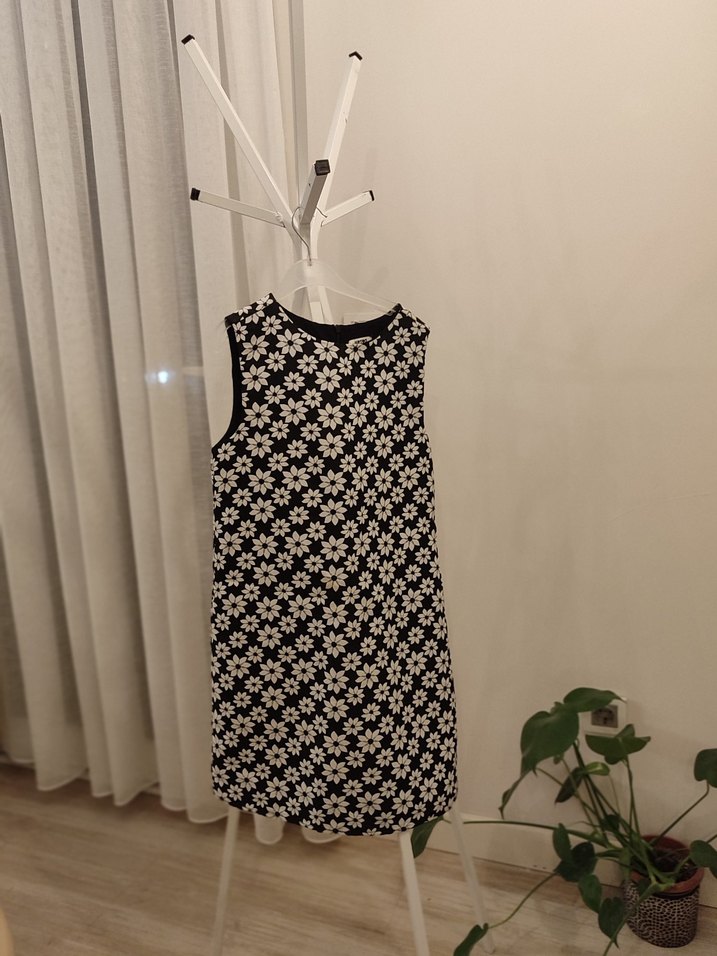 çiçek desenli beyaz ve gri renklerde, kolsuz, normal boy elbisesi. Günlük kullanıma uygundur.