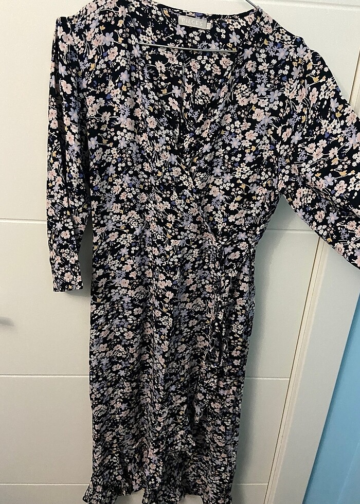 Sadece bir kere giyildi hiçbir sorunu yok tertemiz. Kolları yarım kol. Önünde yırtmacı ve bağlama detayı var, beli lastikli. M beden ama L uyumlu bence