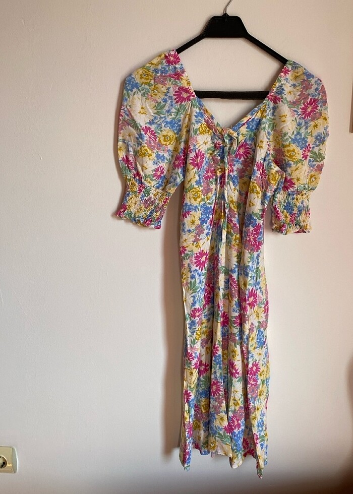 Belden oturtmalı A kesim midi elbise göğüs kısmı büzülerek istenilen seviyede ayarlanabilir kollarında lastik olduğundan hafif balon kol duran tatlı bir elbise