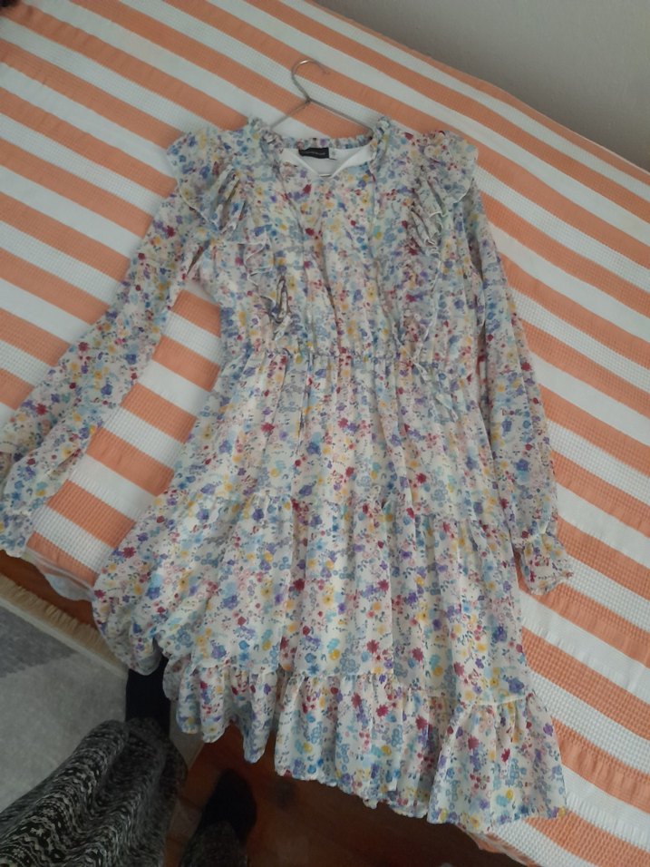 TIFFANY&TOVATO marka,, uzun kollu, V yaka, çok renkli çiçek desenli elbise, bol kesim Günlük kullanım için midi boyda.ince ve rahat bir kumaşı var.hic giymedim.