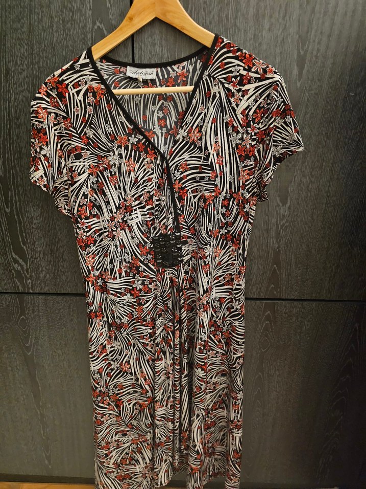 Bohem tarzı kısa kollu, V yaka uzun hamile tunik. Bol kesim, düğmeli ve çok renkli desenli sentetik kumaştan üretilmiştir. Günlük kullanıma uygundur.
