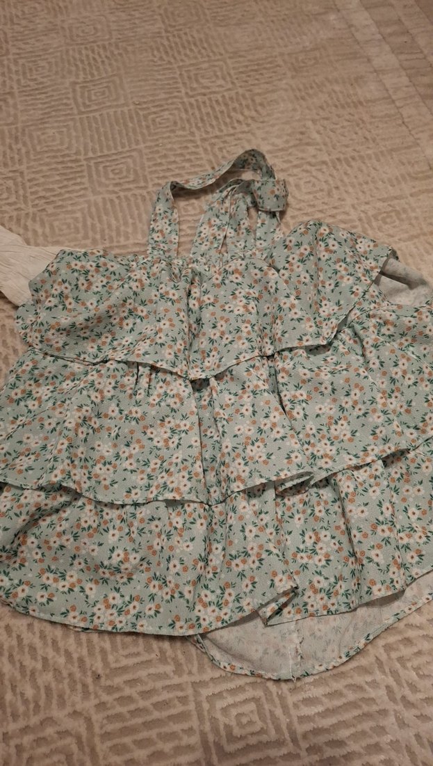 Pastel bej renkli, çiçek desenli, kat kat tasarıma sahip yumuşak dokulu gömlegi ile beraber