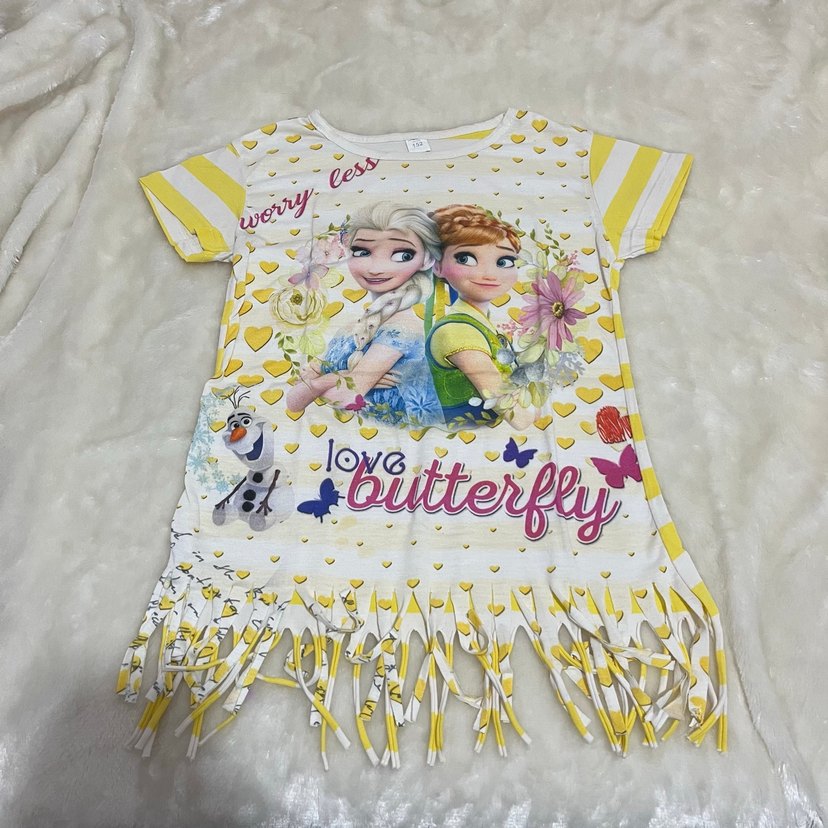 Renkli, kısa kollu, yuvarlak yakalı kız çocuk tişörtü. Sentetik yumuşak kumaştan, baskılı ve dantel detaylıdır. Salaş kesim ve püsküllü alt ucu bohem tarzındadır.