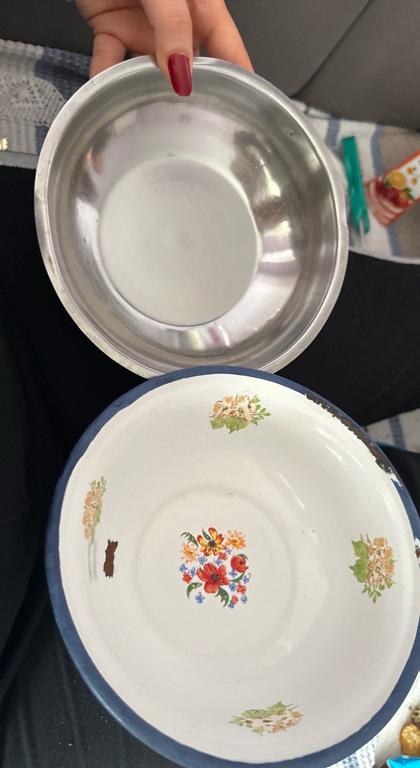 Mavi kenarlı, renkli çiçek desenli beyaz emaye tabak ve sade metal tabak, yemek sunumu için uygun.