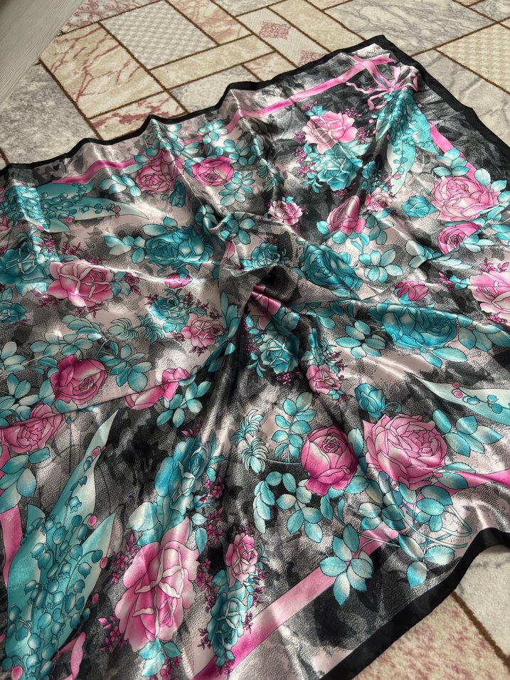 Çiçek desenli, gri tonlarında çok renkli, yumuşak sentetik kumaştan yapılmış, drapeli kadın fularıdır.