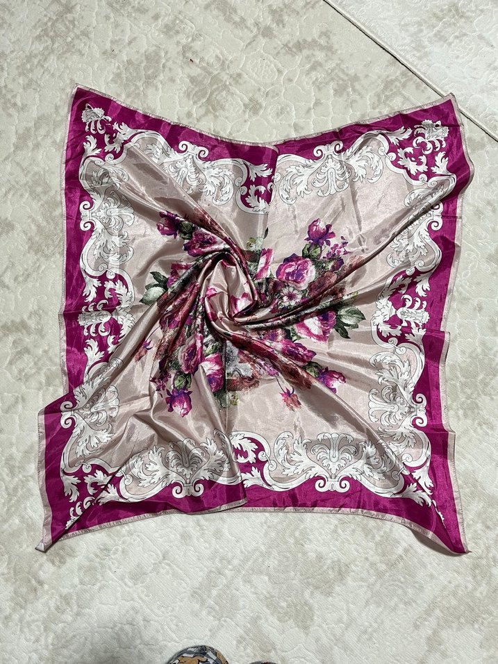 Kadın fular, ipeksi dokulu ve dantel detaylıdır. Açık pembe çiçek desenleriyle bohem ve retro tarzları yansıtır.