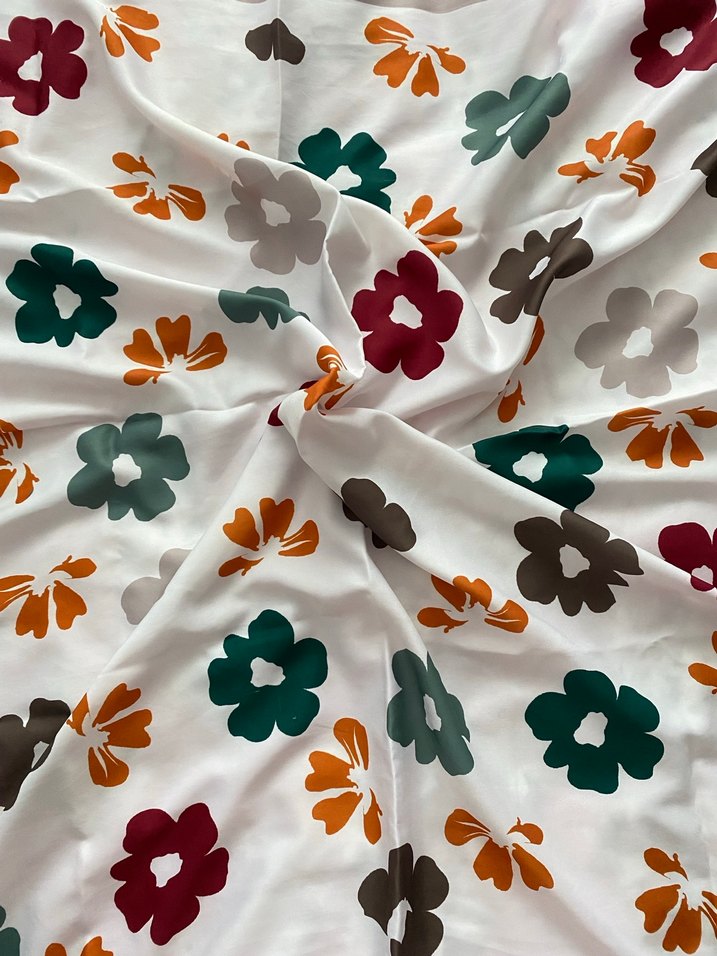 Çiçek desenli, hafif çok renkli ve yumuşak sentetik kumaştan bohem tarzda kadın fular.