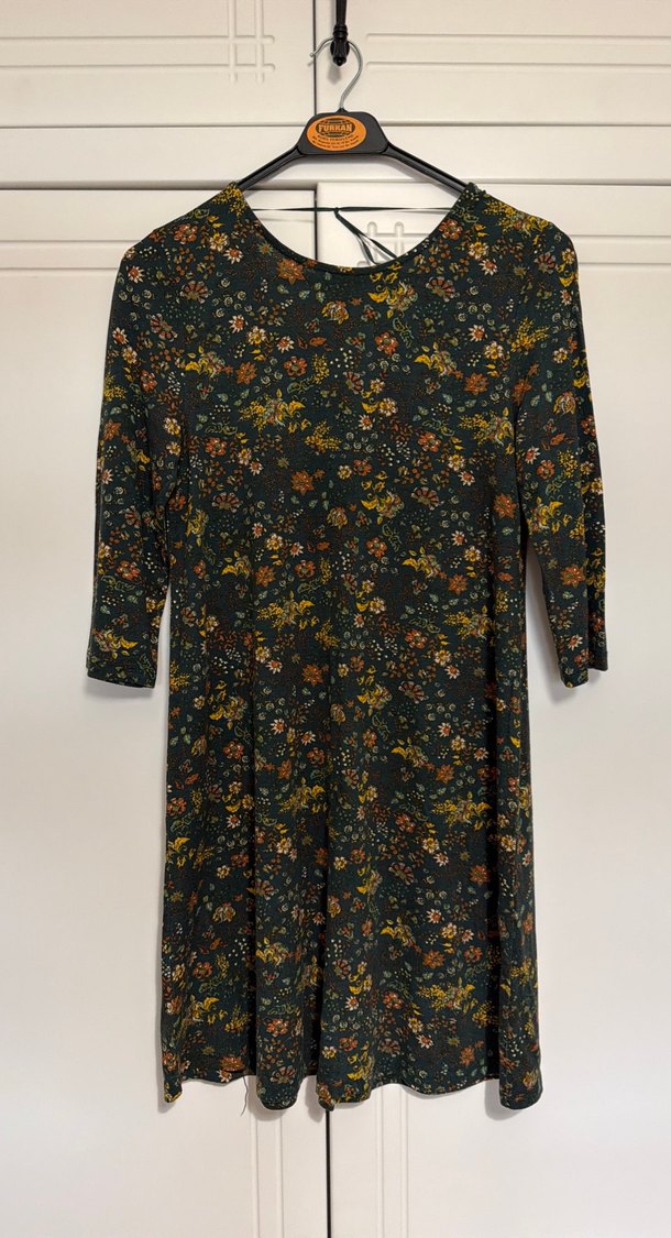 Koyu renkli, çok renkli çiçek desenli mini boy elbise, kısa, fakir kollu ve yuvarlak yakalıdır. Sırtı v şeklinde gelir.