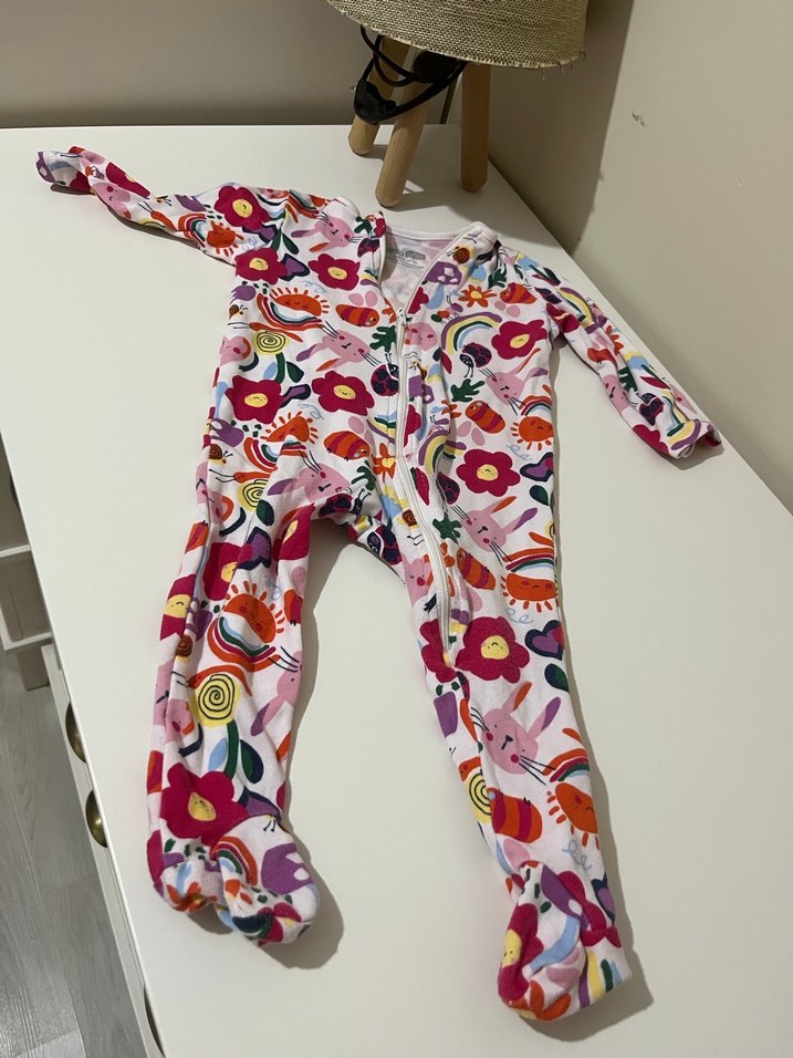 Çiçek desenli, fermuarlı bebek kız tulumu. Ayakları kapalı ve uzun kolludur.
