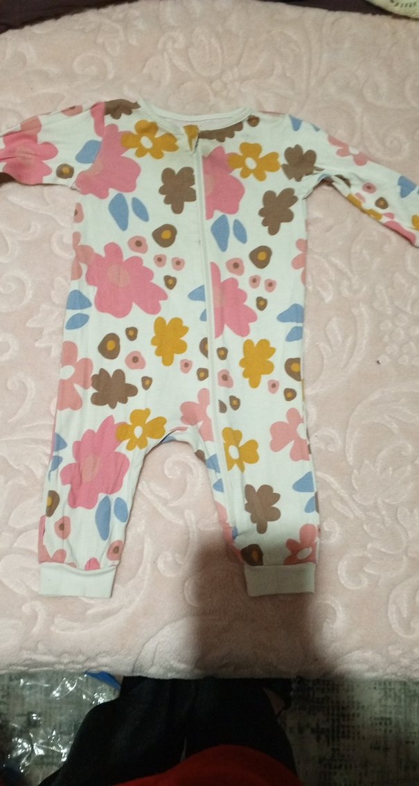 Fermuarlı, pastel renkli çiçek desenli bebek kız tulumu, yumuşak kumaştan üretilmiştir. Çok renkli deseniyle rahat kullanım sağlar. ya kısmında leke var kullanımdan kaynaklı ben deterjansız yıkıyorum belki o yüzden çıkmamıştır 6aylık giydi en son hafif bacakları kısa geldi sadece gayet kullankşlı bir parçaydı bizim için