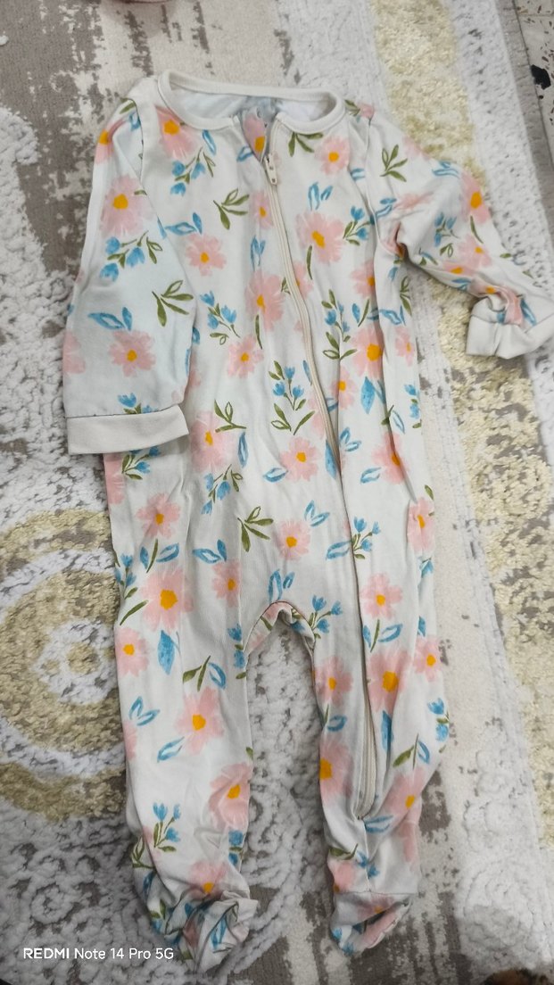 Pastel çiçek desenli, beyaz renkte, fermuarlı bebek tulumu.
