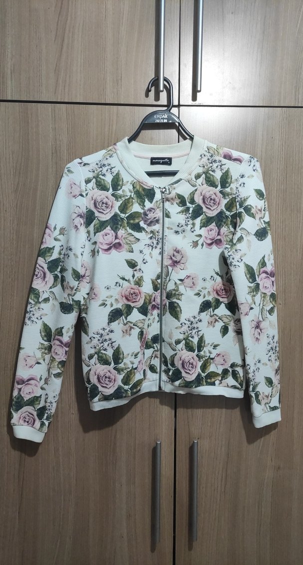 Bej renkli, uzun kollu, çiçek desenli ve fermuarlı kadın ceket. Rahat kalıp ve yuvarlak yaka ile günlük kullanıma uygun.
