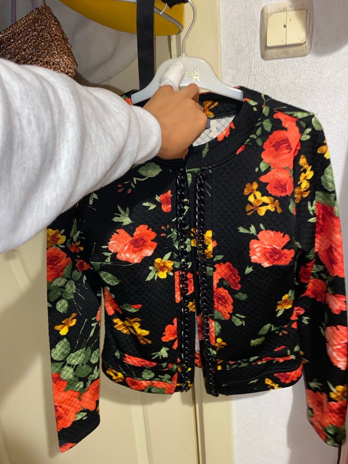 Dar kesim, uzun kollu, yüksek yakalı ve fermuarlı kadın ceketi. Koyu renkli sentetik kumaş üzerinde çiçek desenlidir, günlük ve sokak stiline uygundur.