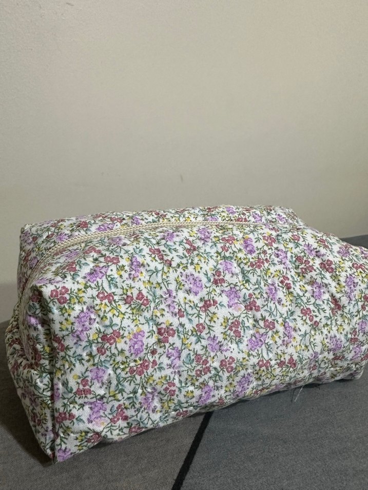 Pastel çiçek desenli, yumuşak sentetik kumaştan yapılmış bohem tarzı makyaj çantası. Fermuarlı ve günlük kullanıma uygun.
