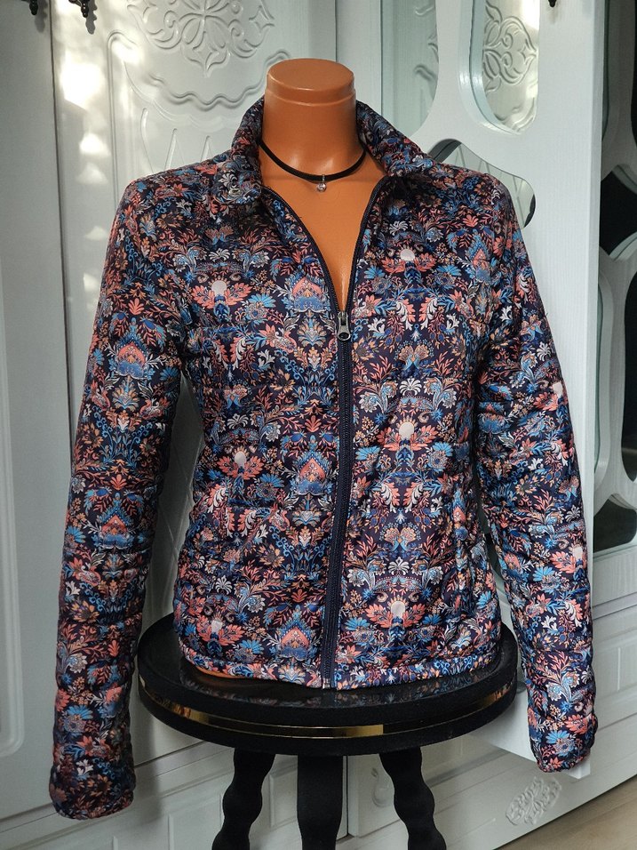 Fermuarlı, yüksek yakalı, uzun kollu, çiçek desenli, normal boyda, rahat kesim kadın mont.