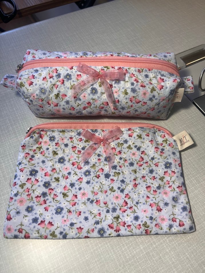 Kadın makyaj çantası, yumuşak pamuk kumaş üzerine çiçek desenli, pastel pembe fermuar ve kurdele detaylıdır. Fermuarlı kapanışı ile güvenli kullanım sunar.
