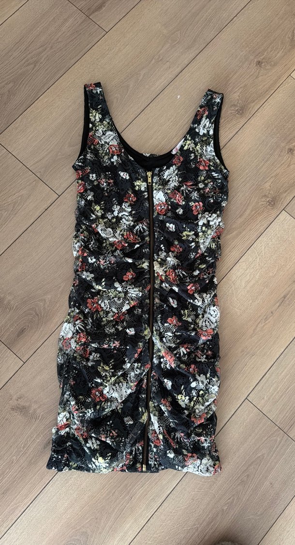 Kolsuz, vücuda oturan bu mini elbise, ön fermuar ve koyu çok renkli çiçek desenine sahip, yumuşak sentetik kumaştan, bohem ve retro sokak tarzını yansıtıyor.