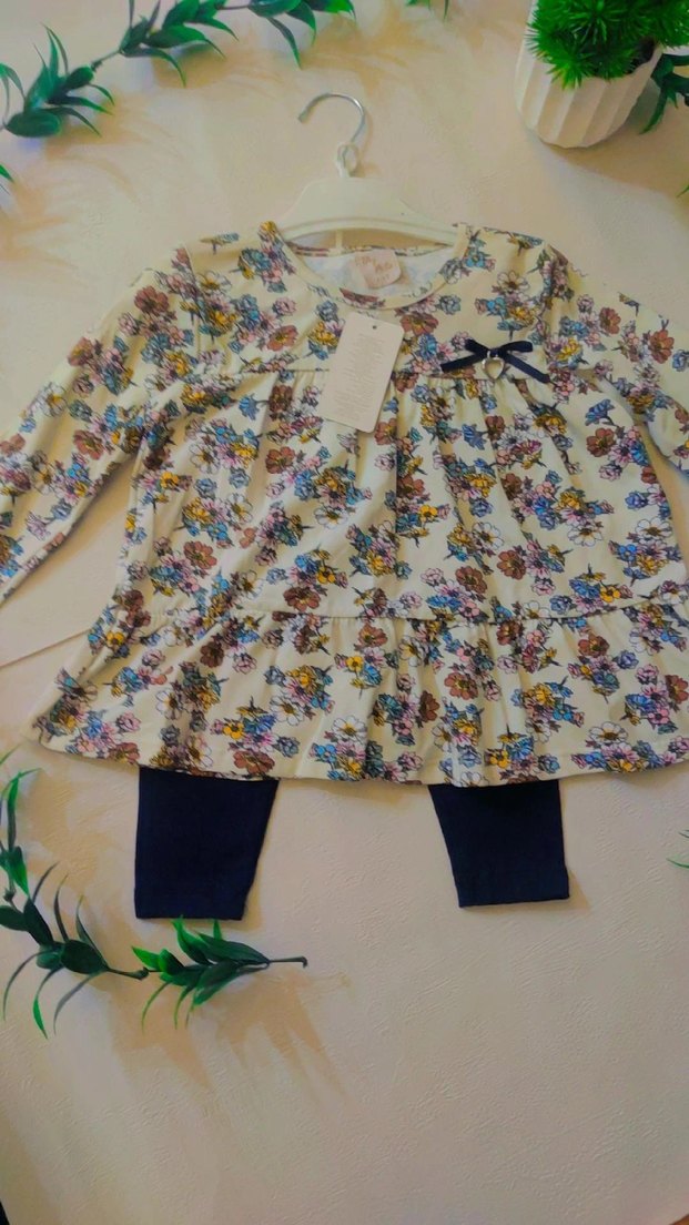 Uzun kollu, çok renkli çiçek desenli ve fırfırlı detaylı bebek kız takımı. Üzerinde koyu renk tayt bulunur.