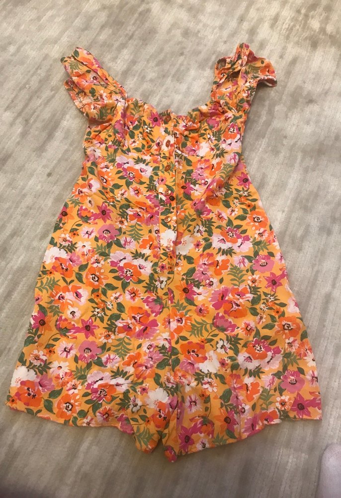 Bebek kız tulumu, pastel çiçek desenli ve fırfırlı askılarla yumuşak, renkli bir görünüm sunar.