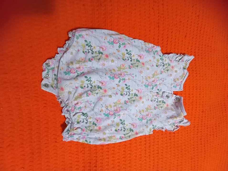 Pastel çiçek desenli, kollarda ve paçalarda fırfır detaylı bebek tulumu. Kolay giydirme için çıtçıtlı, rahat kesim.