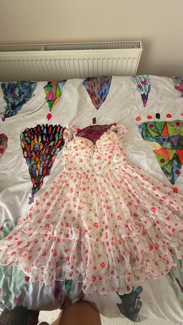 Çiçek Desenli Fırfırlı Beyaz Midi Elbise