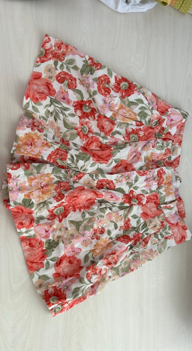 Çiçek desenli, fırfırlı ve bol kesim etek şort. Hafif çok renkli, yumuşak sentetik kumaştan, bohem tarzda