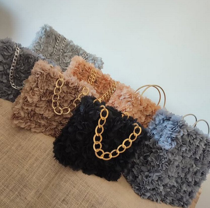 Çiçek desenli fırfırlı bohem kadın çantası, yumuşak sentetik kumaştan üretilmiş, altın zincir detaylı ve çok renkli seçeneklerle sunuluyor.