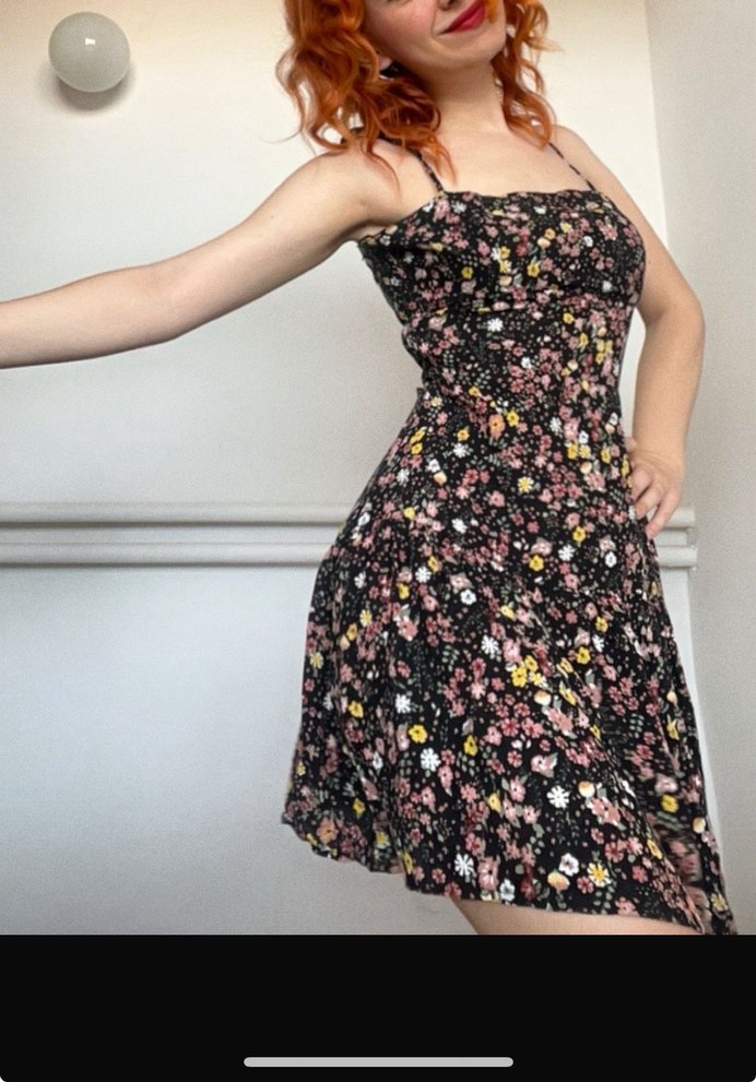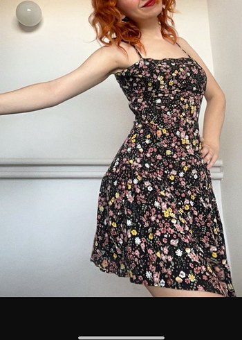 Fırfırlı detaylı, straplez ve askılı, bohem stilde çiçek desenli midi elbise. Yumuşak sentetik kumaştan, romantik akşamlar için uygun. çok az giydim