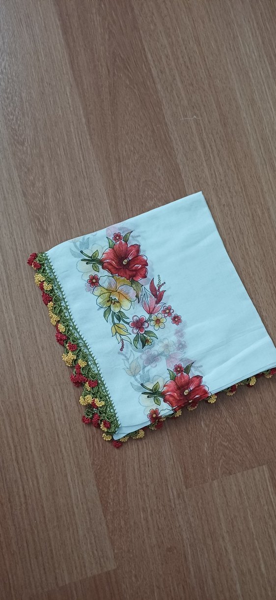 Pastel çok renkli çiçek desenleri ve fırfırlı kenarları olan, tekstil malzemeden yapılmış geleneksel tarzda kadın fuları.
