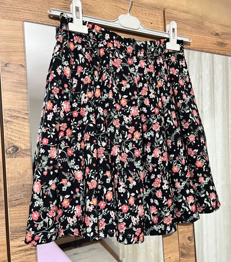 Bol kesim ve fırfır detaylı, çiçek desenli kısa etek. Beli lastikli olduğu için 36-40 beden herkese olur. Şehir boy mini değildir. Bir kaç kez giyildi sıfır ayarında herhangi bir defosu yok.