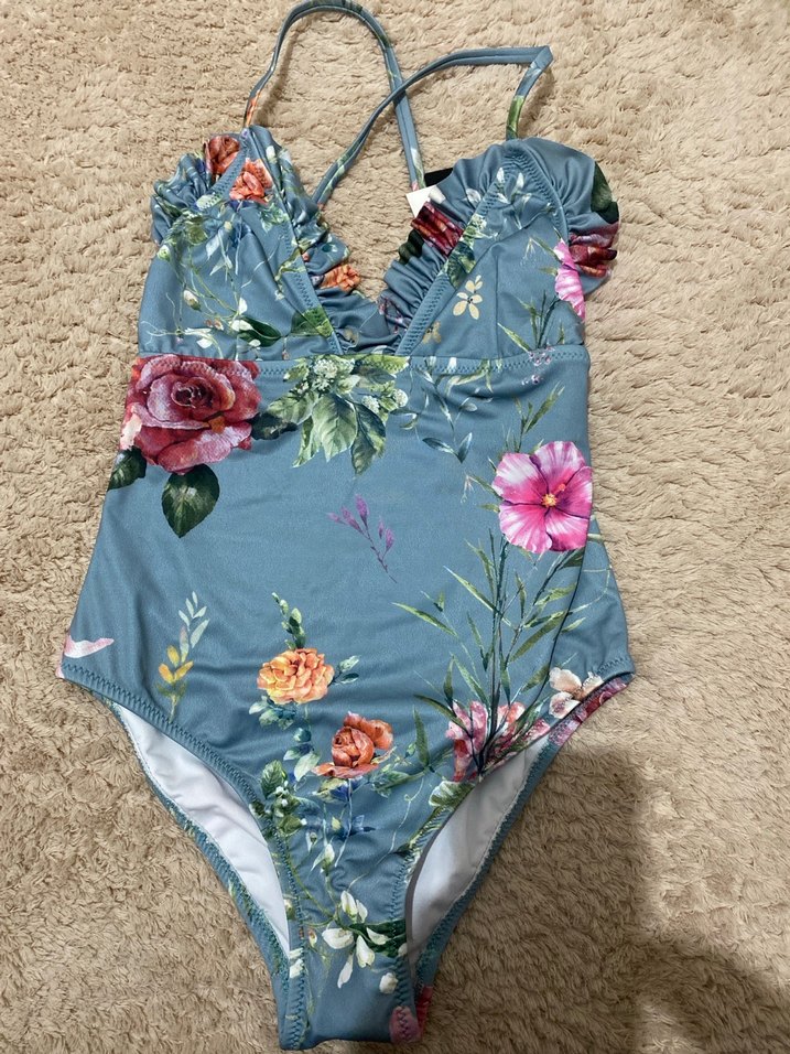 Pastel mavi çiçek desenli, fırfırlı ve ince askılı, bohem tarzda kadın mayo, plaj için uygun.