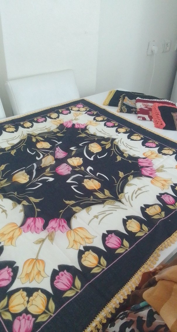 Kadın şalı, koyu renkli çok renkli çiçek desenleri ve fırfır detaylarıyla, yumuşak tekstil kumaştan, mütevazı ve bohem tarzı yansıtıyor.