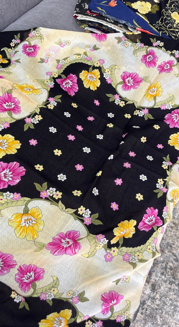 Yumuşak kumaştan, vintage çiçek desenli, karanlık çok renkli ve fırfırlı kenarlarıyla bohem tarzda kadın fuları. Hiç kullanılmamıştır sıfır