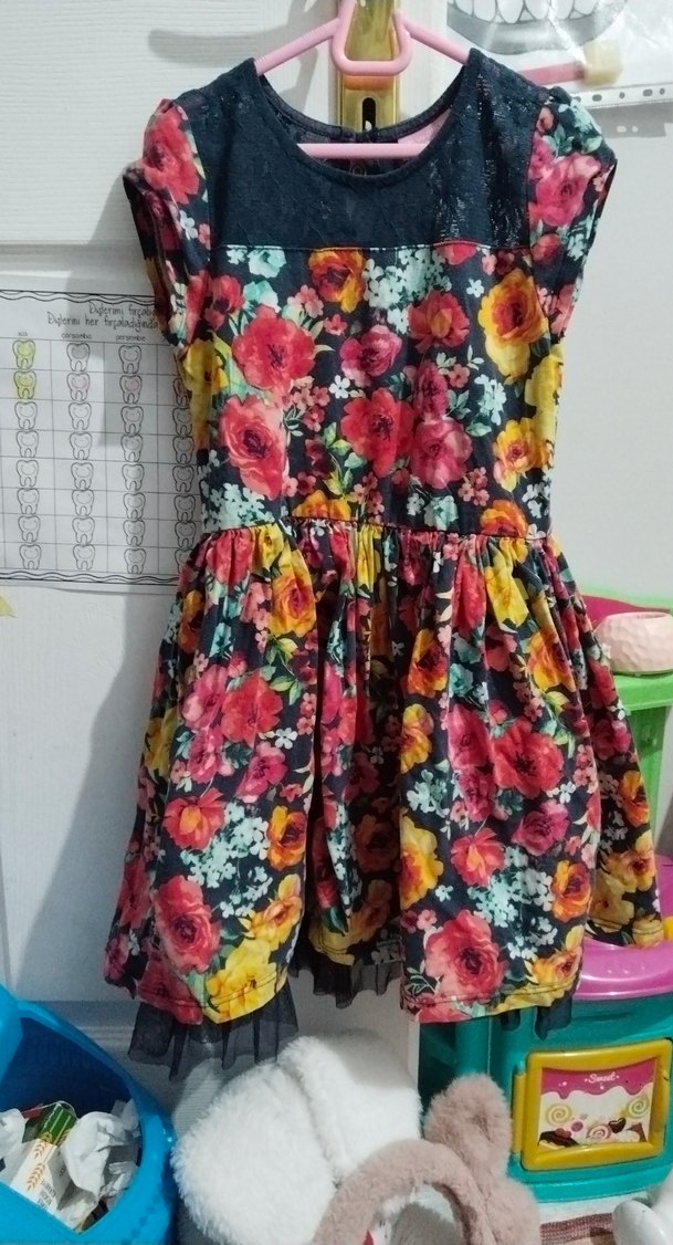 Kolsuz, çiçek desenli ve fırfırlı kız elbisesidir. Straplez yakalı, bohem tarzda ve yumuşak sentetik kumaştan yapılmıştır.